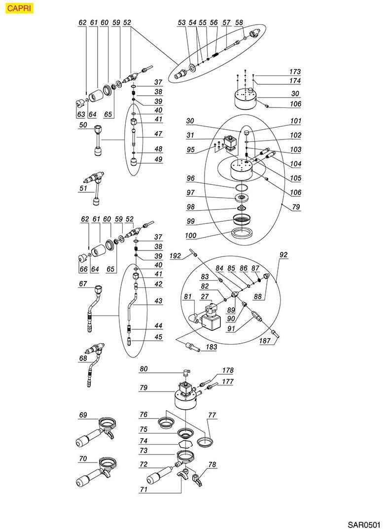 Skupina (hlava) a ventil horké vody a páry kávovaru Sanremo CAPRI