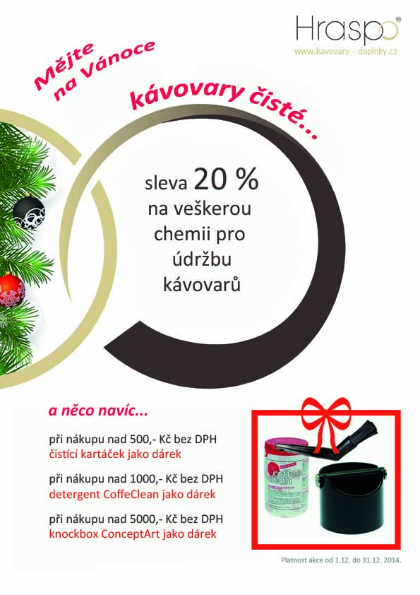 chtěli bychom Vás informovat o naší předvánoční akci na chemii pro údržbu kávovarů. Na kompletní sortiment chemie pro údržbu kávovarů nabízíme dodatečnou slevu 20%. Navíc při nákupu náhradních dílů, potřeb pro baristy a chemie na údržbu kávovarů nad 500,- Kč bez DPH dostanete čistící kartáček ZDARMA, při nákupu nad 1000,- Kč bez DPH balení detergentu 900g a při nákupu nad 5000,- Kč bez DPH knockbox ConceptArt ZDARMA.